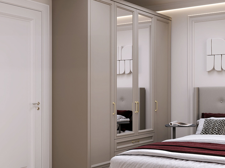 - Шкаф 4-створчатый с центральными зеркальными фасадами, 2 боковыми глухими фасадами и 2 выдвижными ящиками;