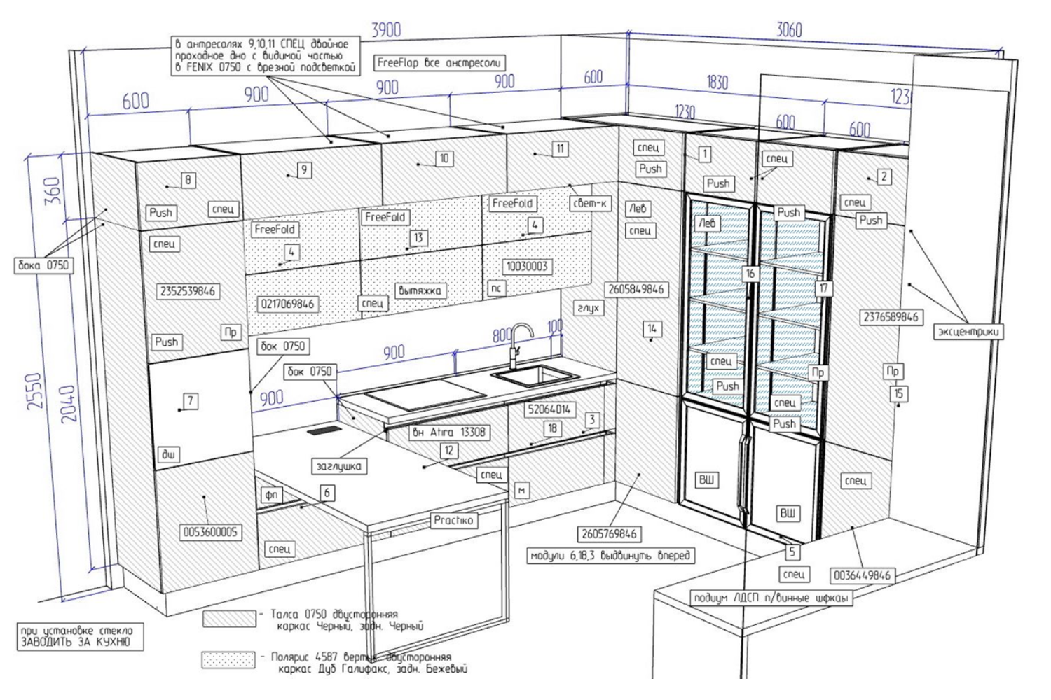 Фасады МДФ в пластике Fenix, столешница ДСП в пластике