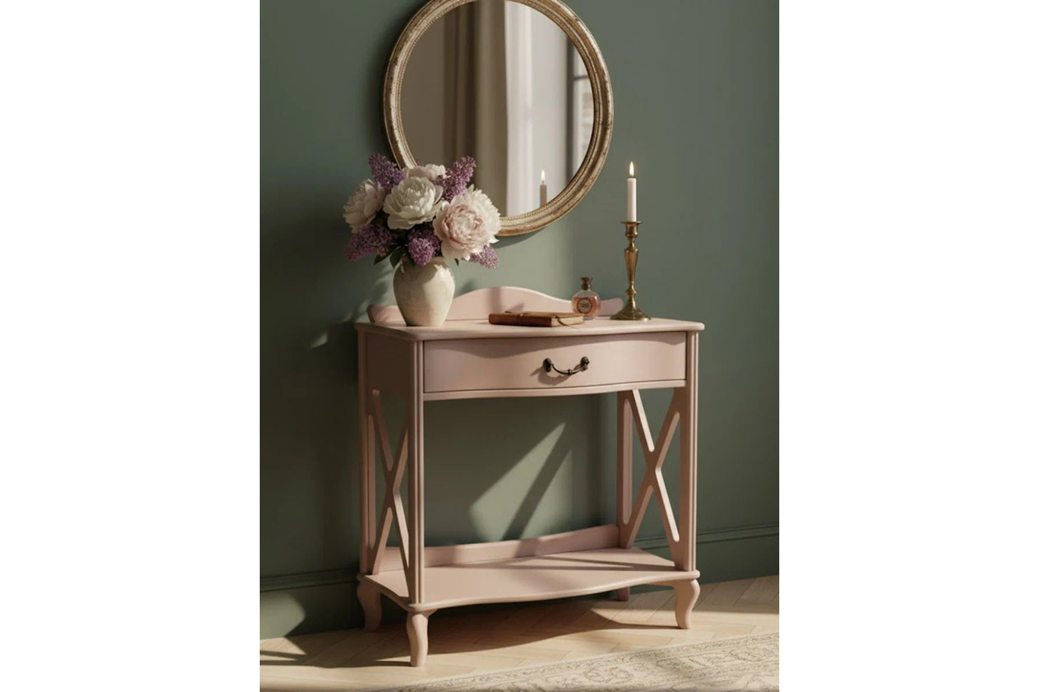 Узкий консольный столик «Джульетта» в цвете мокко предназначен для декоративных целей — на небольшую поверхность можно поместить вазу, сувенир, необычную статуэтку. Внешний вид изделия соответствует интерьерному стилю прованс. Бежевый оттенок, фигурная форма, изогнутые ножки, фурнитура в цвете «античная бронза» превосходно впишутся и в классическую обстановку. Основание модели выполнено из МДФ, боковины и столешница — из ЛМДФ, прочие детали изготовлены из шпона натурального ясеня. Изюминка консоли — боковые части в виде декоративных элементов фахверков. В компактном ящике с бесшумным механизмом выдвижения можно хранить любимые книги, косметику, украшения, очки, различные мелочи.